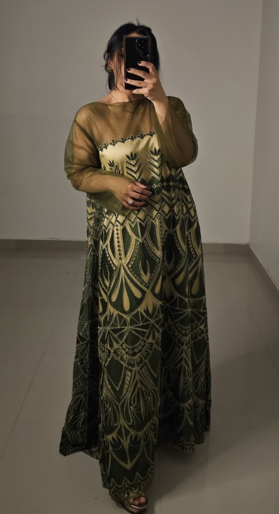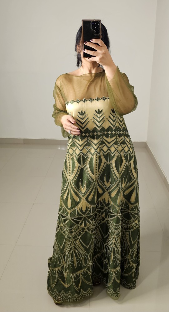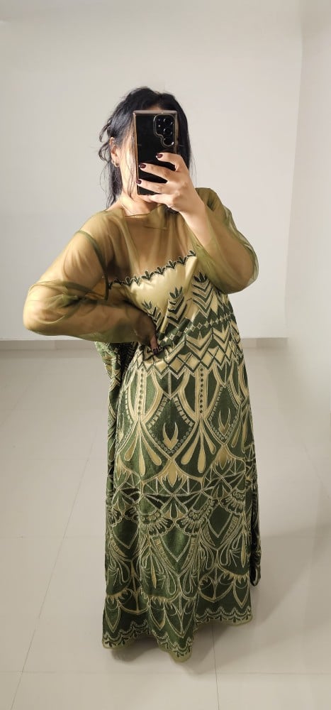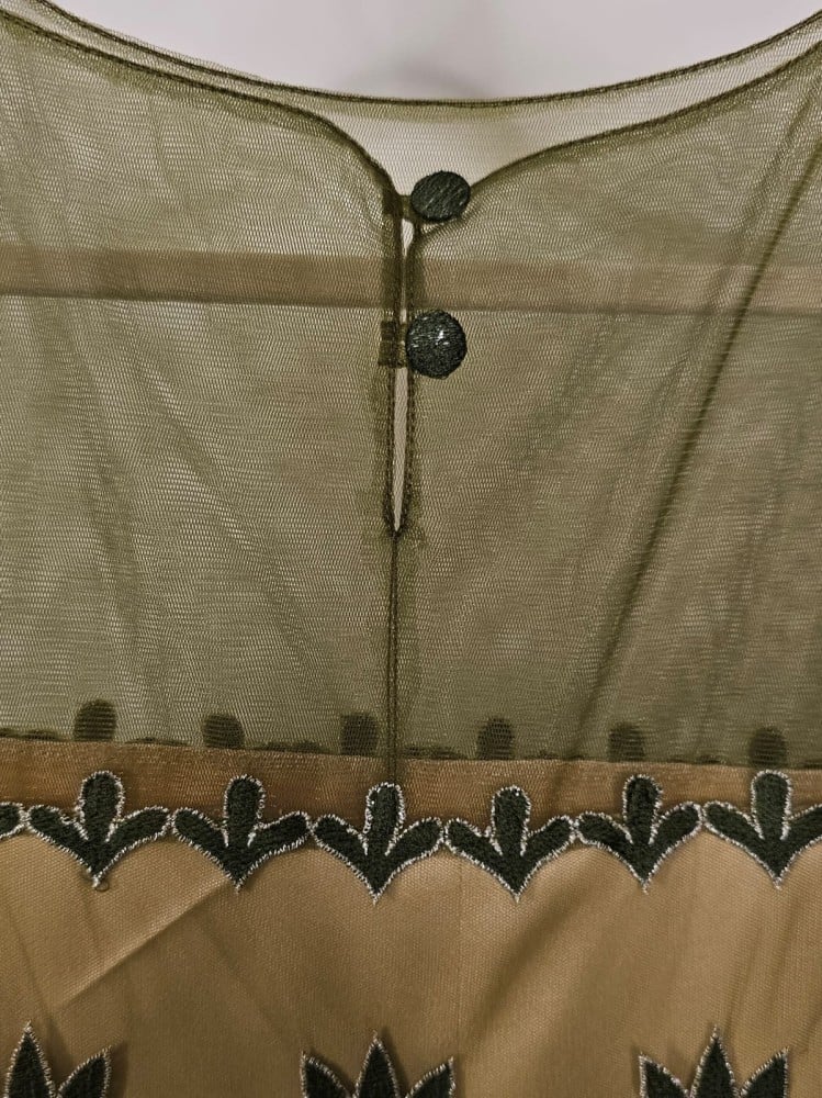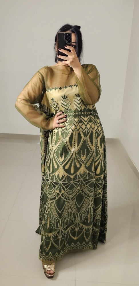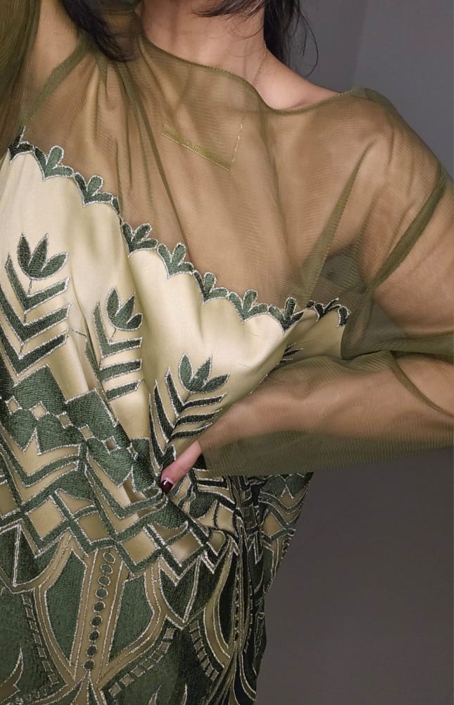 قطعة فريدة من التل المطرز بمزيج من اللون الذهبي والاخضر بنقوش شرقيه , الاكمام من التل لإظهار انوثتك بشكل محافظ وجميل